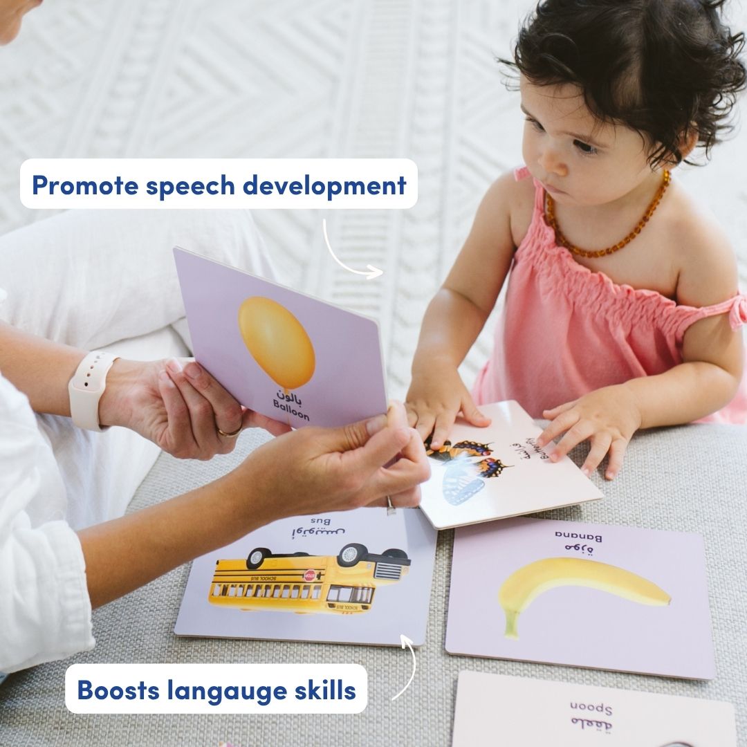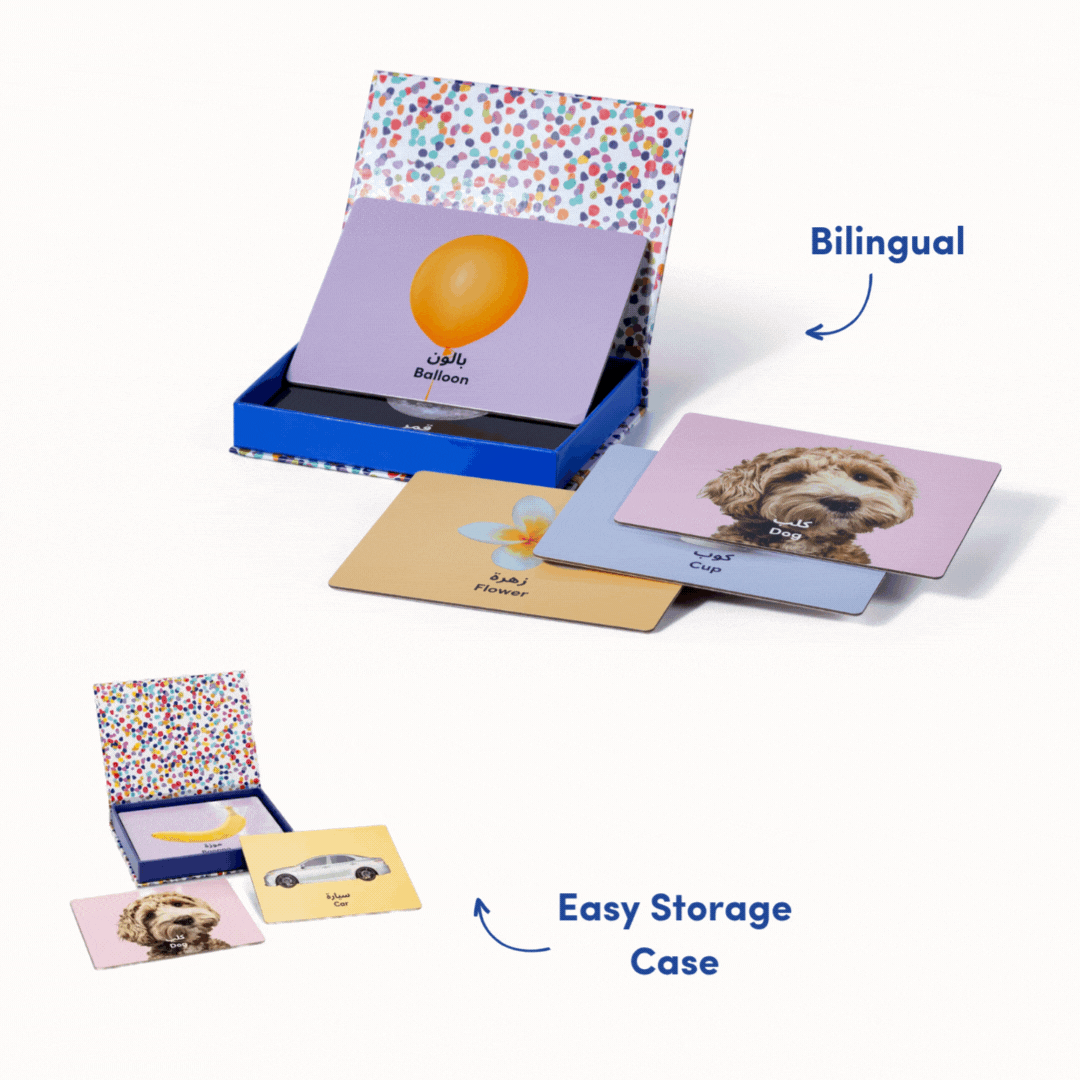 يعزز اكتساب الكلمات الأولى ويعرّف طفلك على الأشياء اليومية بلغتين باستخدام صور من الحياة الواقعية.