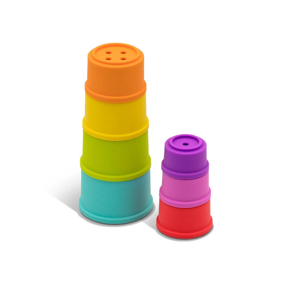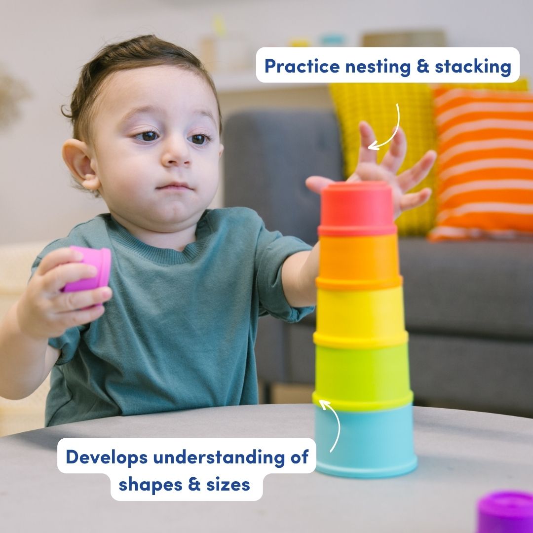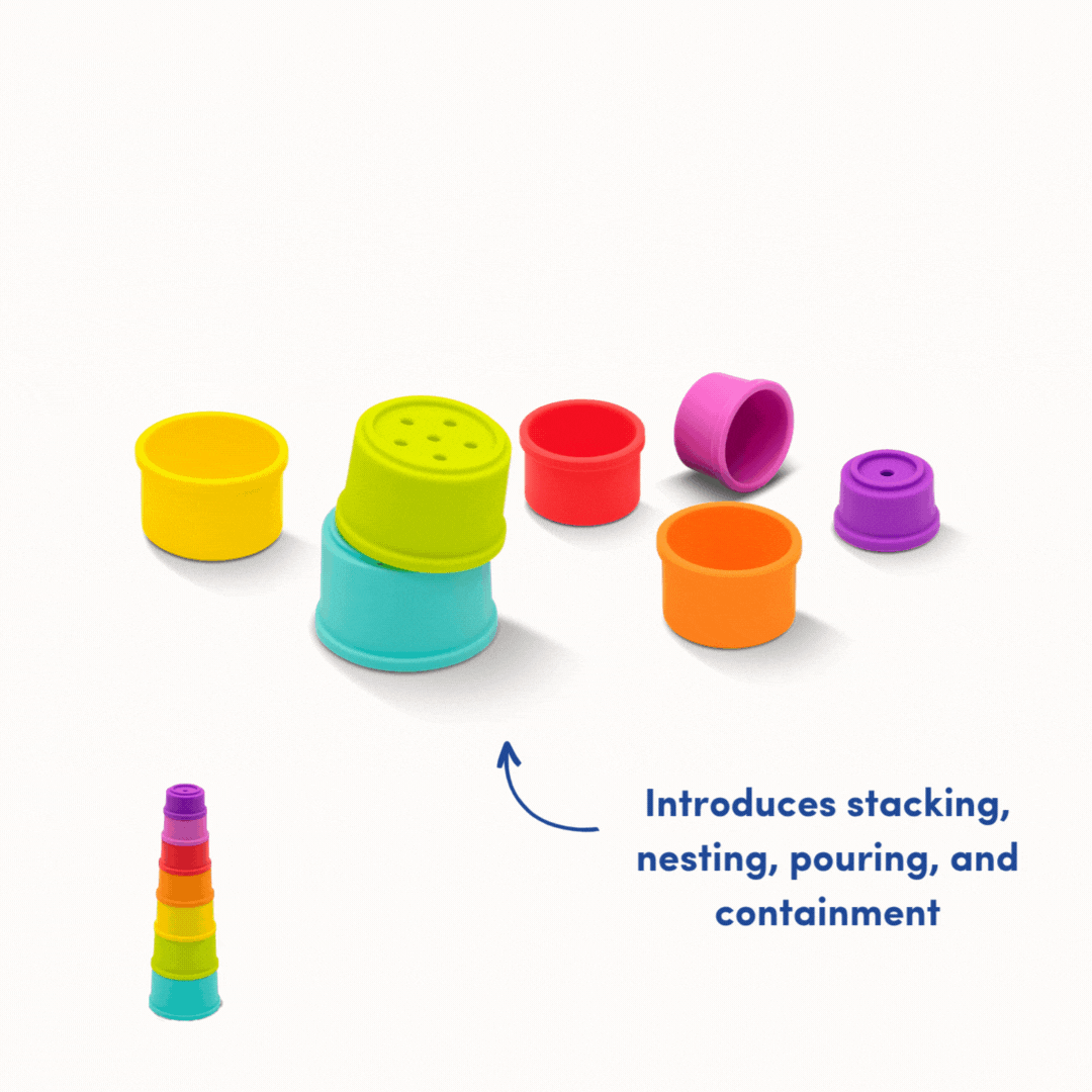 يساعد طفلك على فهم التكديس، والتعشيش، والصب، والاحتواء؛ آمنة لوضعها في الفم والعض.