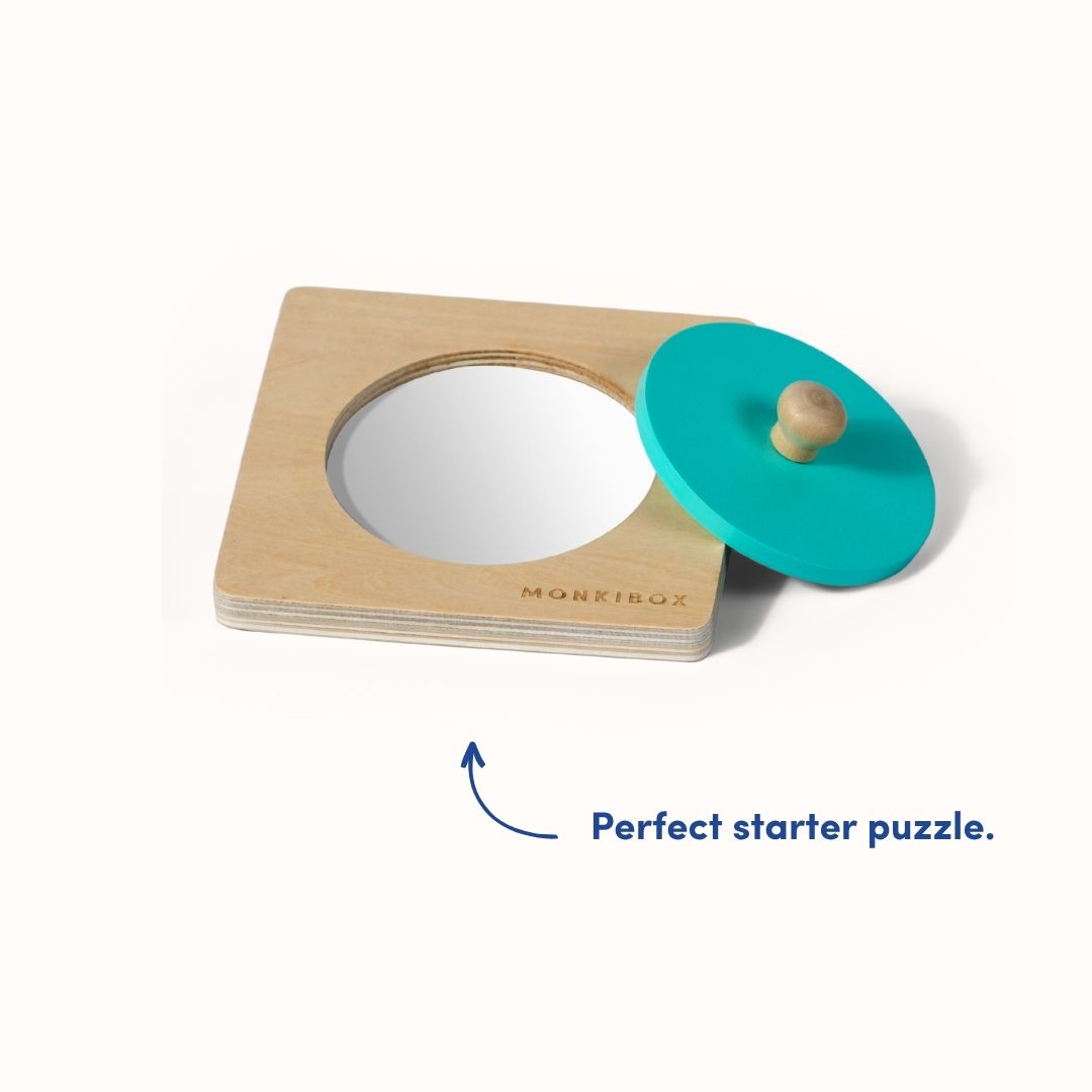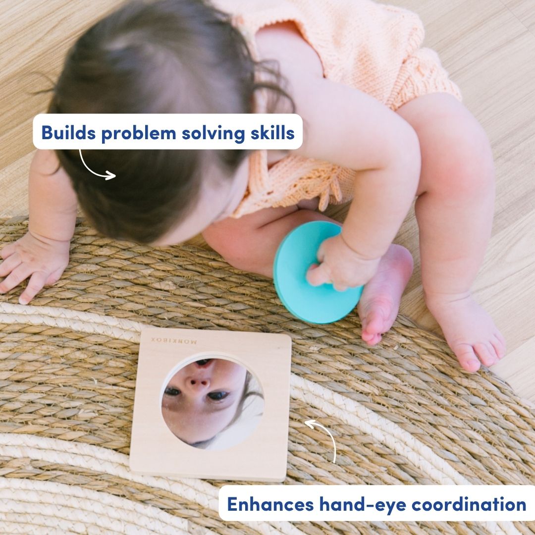 تعزز التنسيق بين اليد والعين من خلال الدائرة بسيطة حيث تشجع طفلك على ممارسة إزالة القطعة ووضعها، مع وجود مرآة بالداخل للعب الممتع.