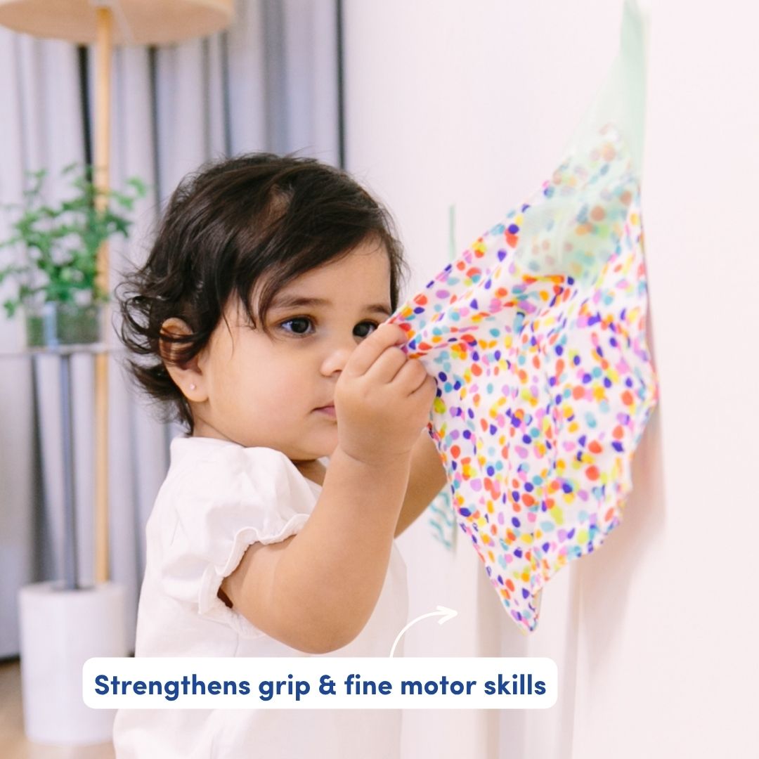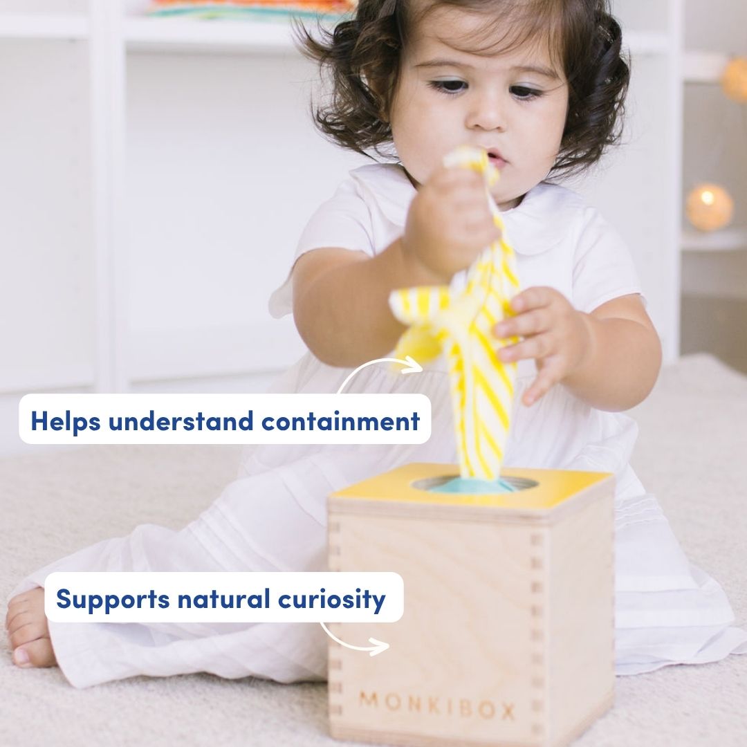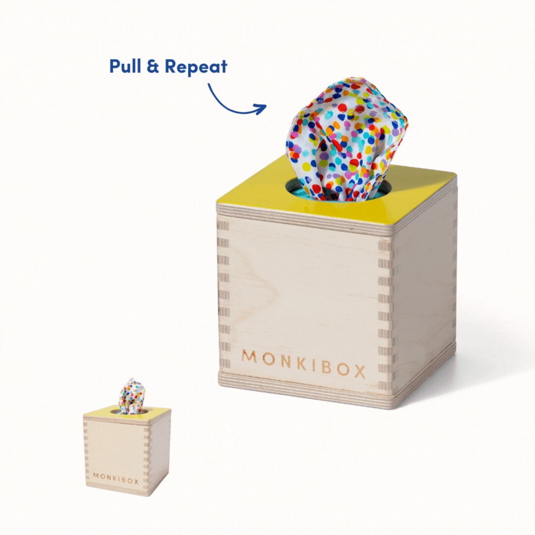 تشجع على الاستكشاف الحسي، والمهارات الحركية الدقيقة، واستكشاف مفهوم الاحتواء بينما يسحب طفلك المناديل الناعمة والملونة.