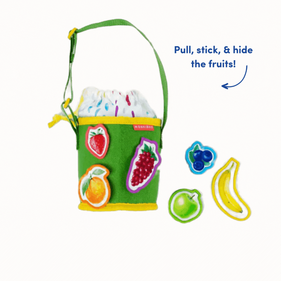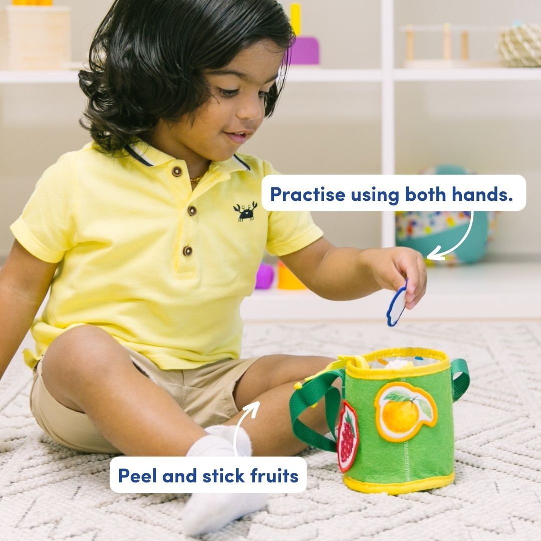 تطور التنسيق الثنائي واللعب التخيلي من خلال سحب الفواكه ولصقها وإخفائها في السلة.