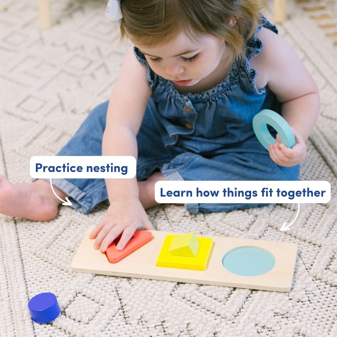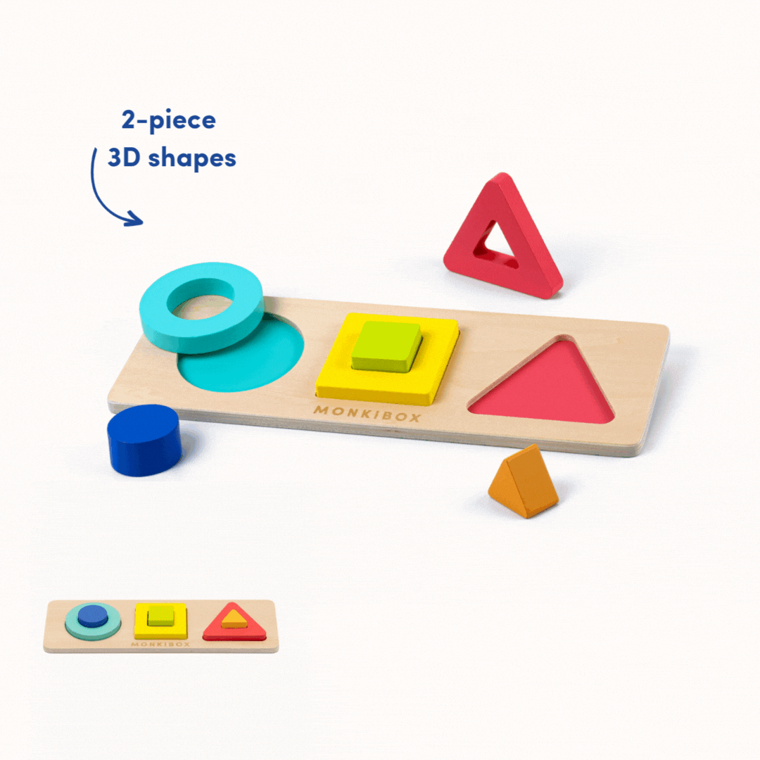 يُعلّم كيفية تجميع القطع معًا أثناء ممارسة مهارات التعشيش باستخدام أشكال ثلاثية الأبعاد مكونة من قطعتين.